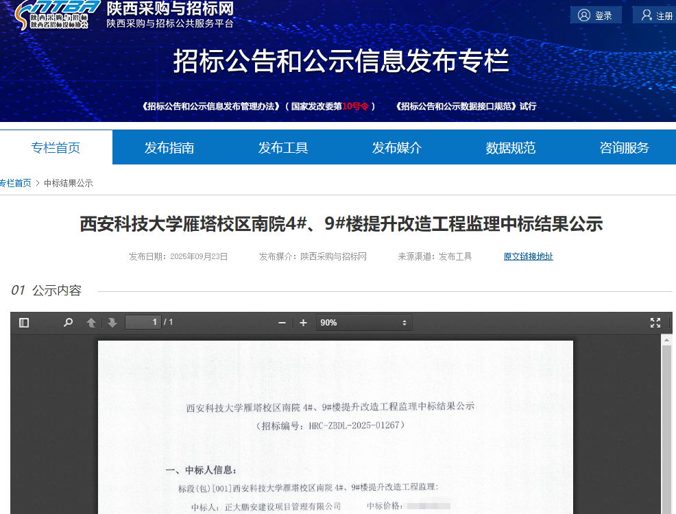 2025年9月23日,經(jīng)評標委員會綜合評審,招標人確認正大鵬安中標西安科技大學雁塔校區(qū)南院4#、9#樓提升改造工程監(jiān)理項目。