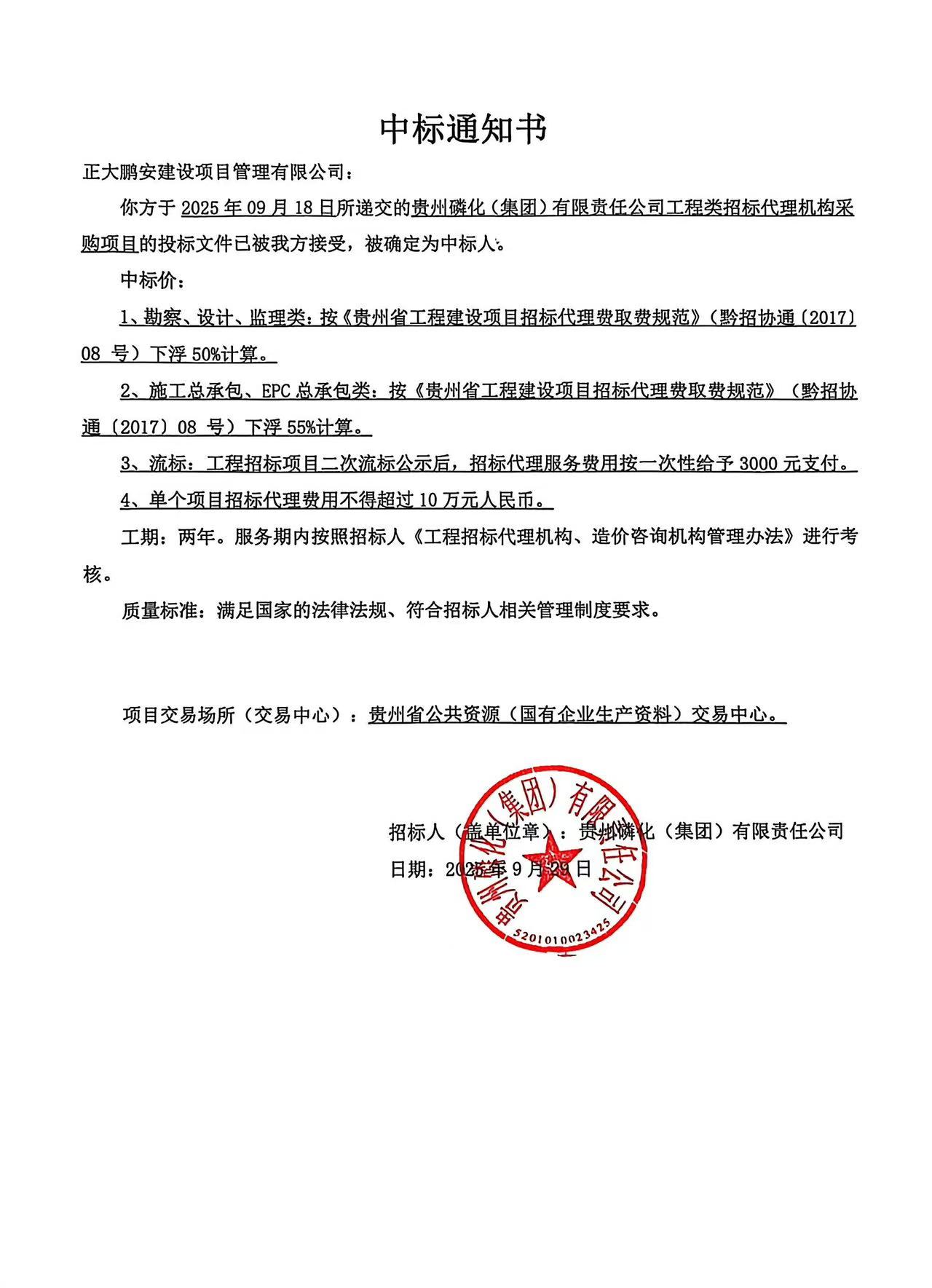 2025年9月29日,經(jīng)評標(biāo)委員會綜合評審,招標(biāo)人確認(rèn),正大鵬安中標(biāo)貴州磷化(集團)有限責(zé)任公司工程類招標(biāo)代理機構(gòu)采購項目。